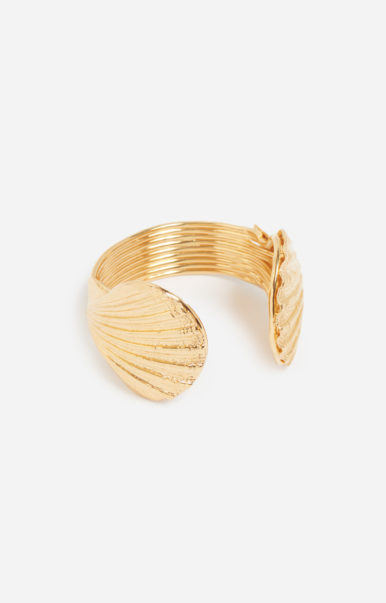 Cette manchette en laiton doré s’inspire de la beauté brute de l’océan avec son design sculptural en forme de coquillage. Son jeu de textures et de reliefs lui confère un éclat raffiné, sublimant le poignet avec élégance et caractère. Grâce à son ouverture ajustable, elle s’adapte parfaitement à toutes les morphologies pour un confort optimal. Pièce statement par excellence, elle ajoute une touche sophistiquée et audacieuse à n’importe quelle tenue, qu’elle soit décontractée ou habillée.