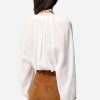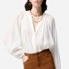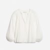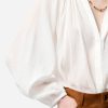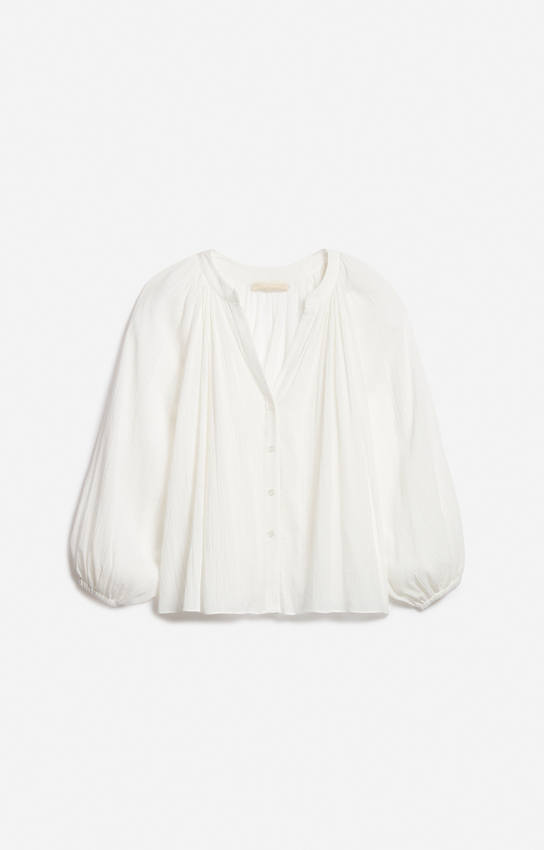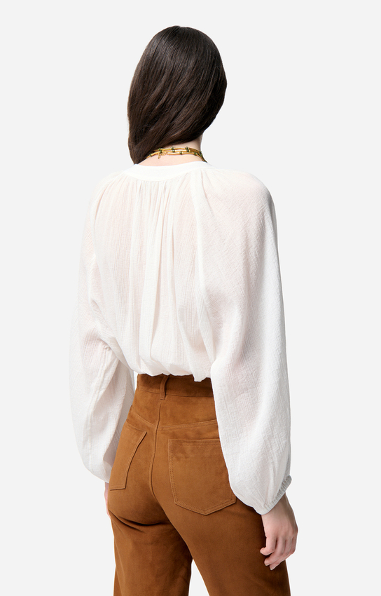 La blouse Edme séduit par son volume vaporeux, ses manches longues légèrement bouffantes et son encolure fendue qui dévoile subtilement le décolleté. Son tissu aérien lui confère un tombé souple et élégant.