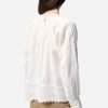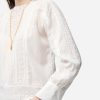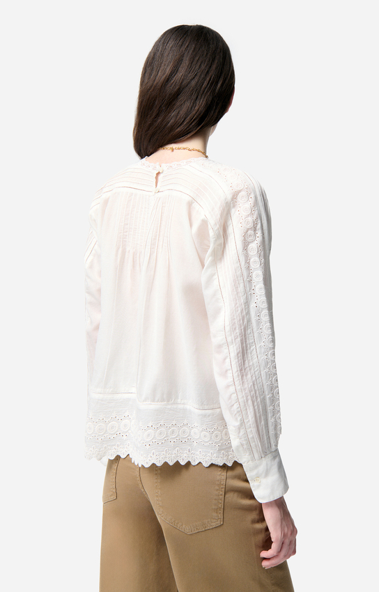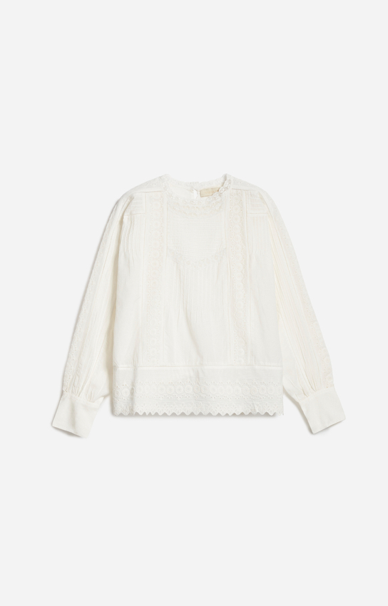 Travail de plis piqués et broderies sur le buste, les bras et le bas de la blouse