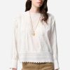 Travail de plis piqués et broderies sur le buste, les bras et le bas de la blouse