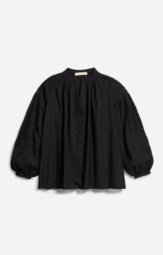 Blouse emblématique de la maison. Sa coupe aérienne confectionnée dans un coton léger et subtilement transparent, fait de Nipoa la blouse romantique par excellence. Avec ses détails de fronces au niveau des manches, sa silhouette se dessine par ses épaules tombantes. Elle se décline cette saison avec des détails de plis et de dentelle incrustée au niveau des manches et sur le devant de l’ouverture boutonnée. Elle se porte avec un jean ou une jupe.