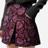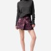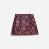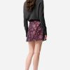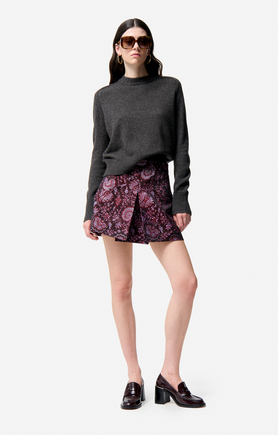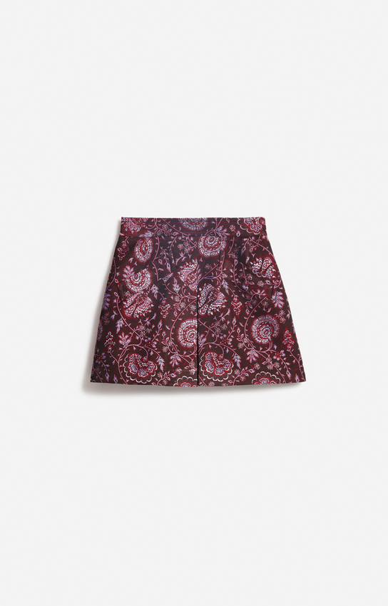 Jupe courte en jacquard bordeaux rehaussée d’un motif floral aux reflets satinés, pour une allure chic et graphique.