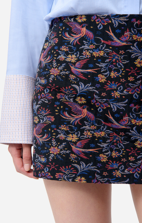 Une mini-jupe en jacquard fleuri qui joue l’équilibre entre charme bohème et allure contemporaine, idéale avec un pull fin ou une chemise fluide.
