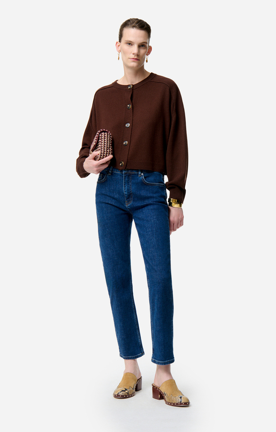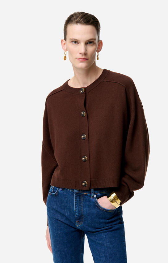 Un cardigan court en maille fluide à la coupe boxy, qui joue sur la simplicité d’une silhouette épurée.