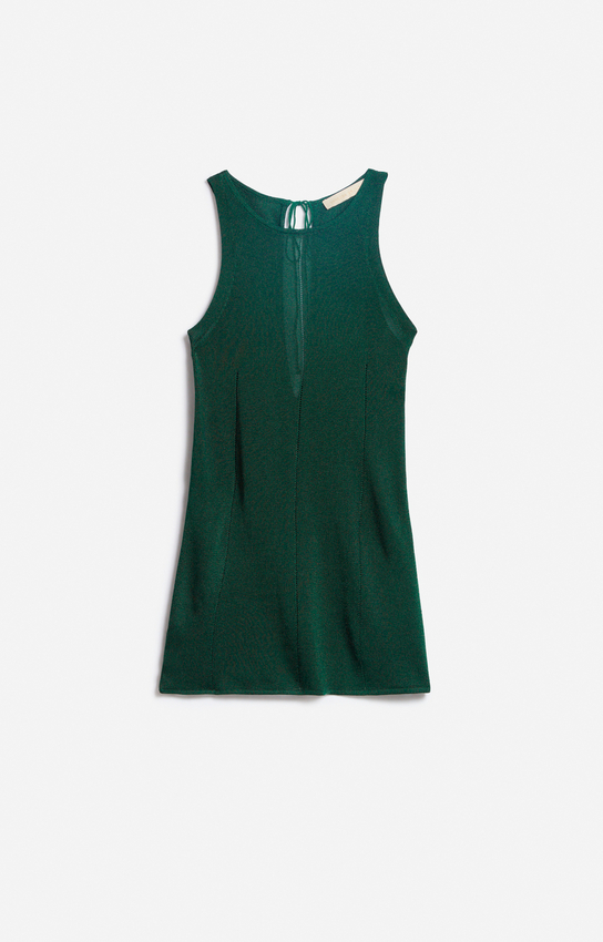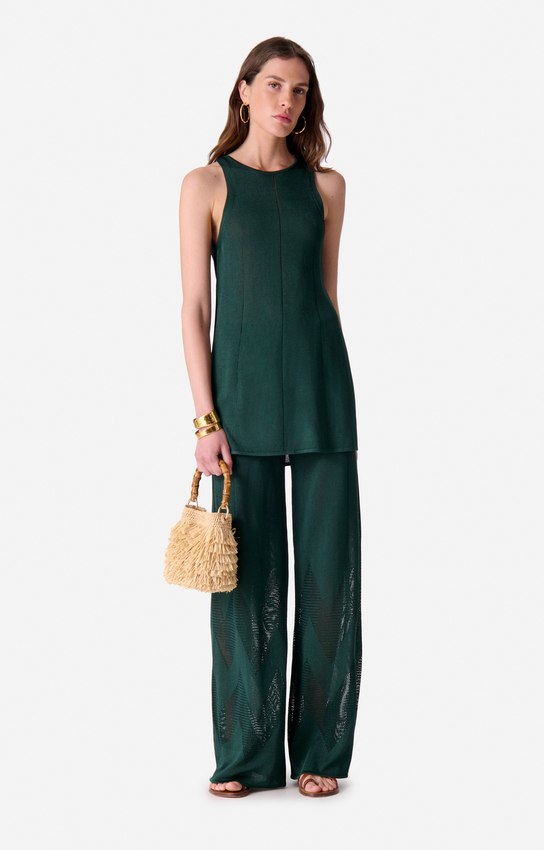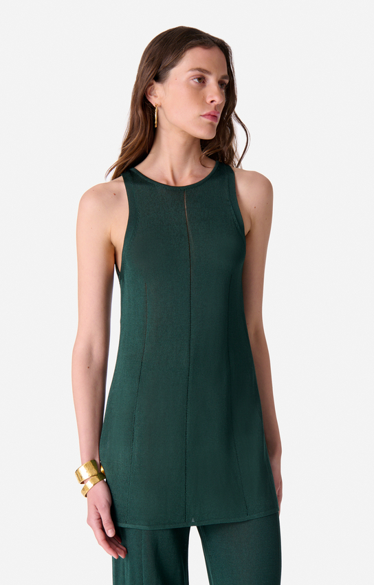 épure et modernité définissent ce top long en maille fine, à l’élégance discrète. Sa coupe droite et allongée dessine une silhouette élancée, tandis que les fines lignes ajourées verticales apportent structure et raffinement. Son encolure arrondie et ses emmanchures américaines dévoilent subtilement les épaules, pour une allure à la fois minimaliste et sophistiquée.
