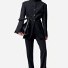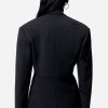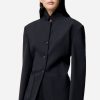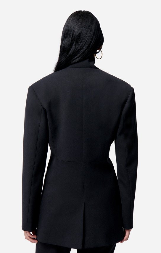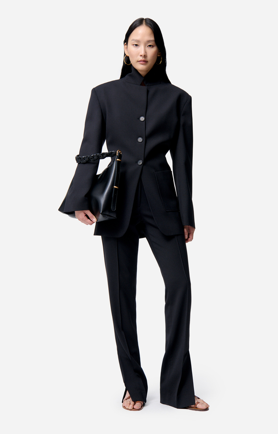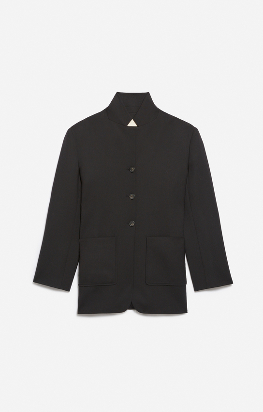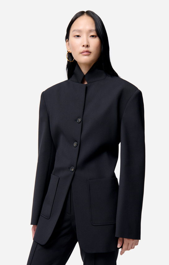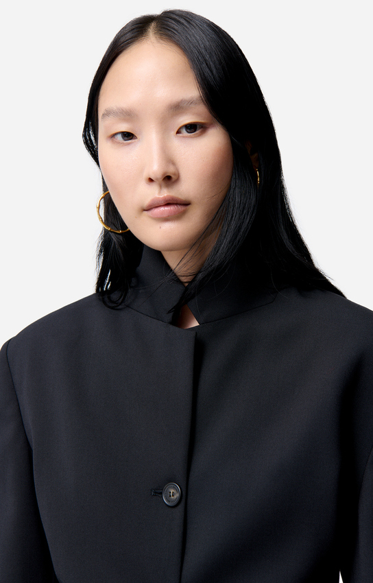 Un tailoring épuré au col montant, pour une élégance graphique et affirmée.