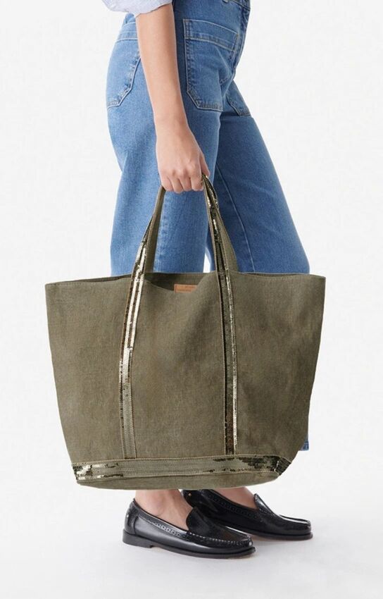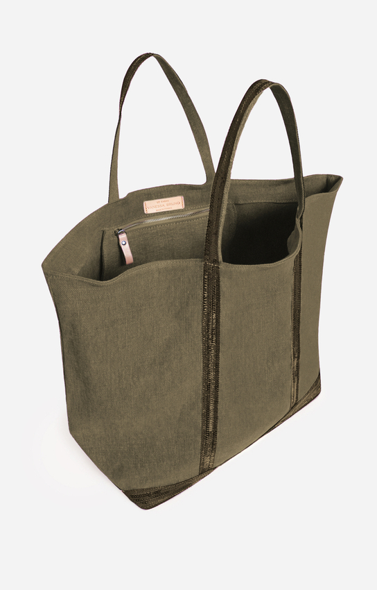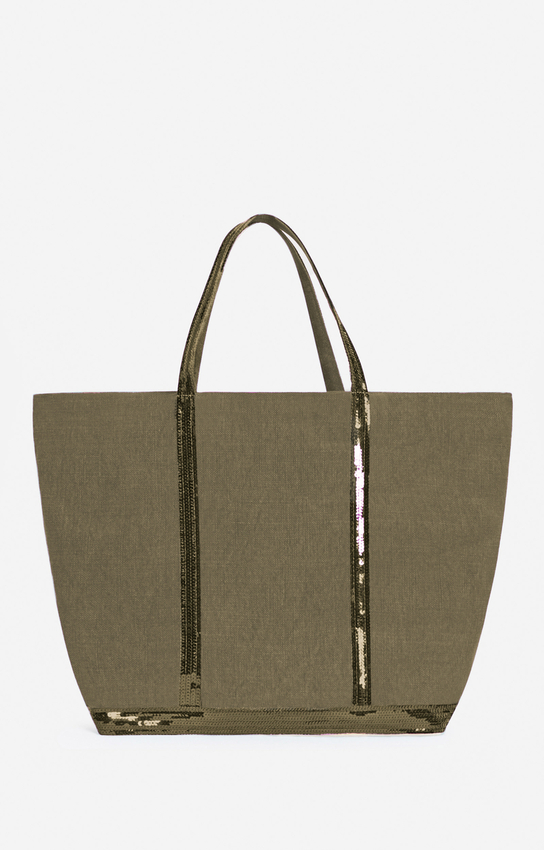 Sac cabas taille XL en lin et à sequins.